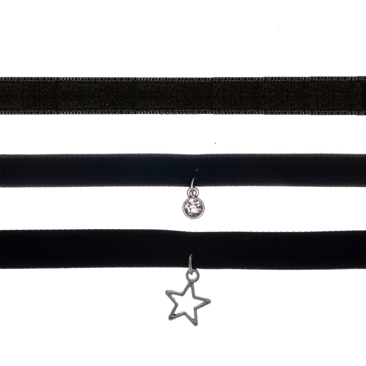 The set includes three different velvet choker necklaces that allow you to create exactly the look you want – classic, rock-inspired, or festively sparkling.