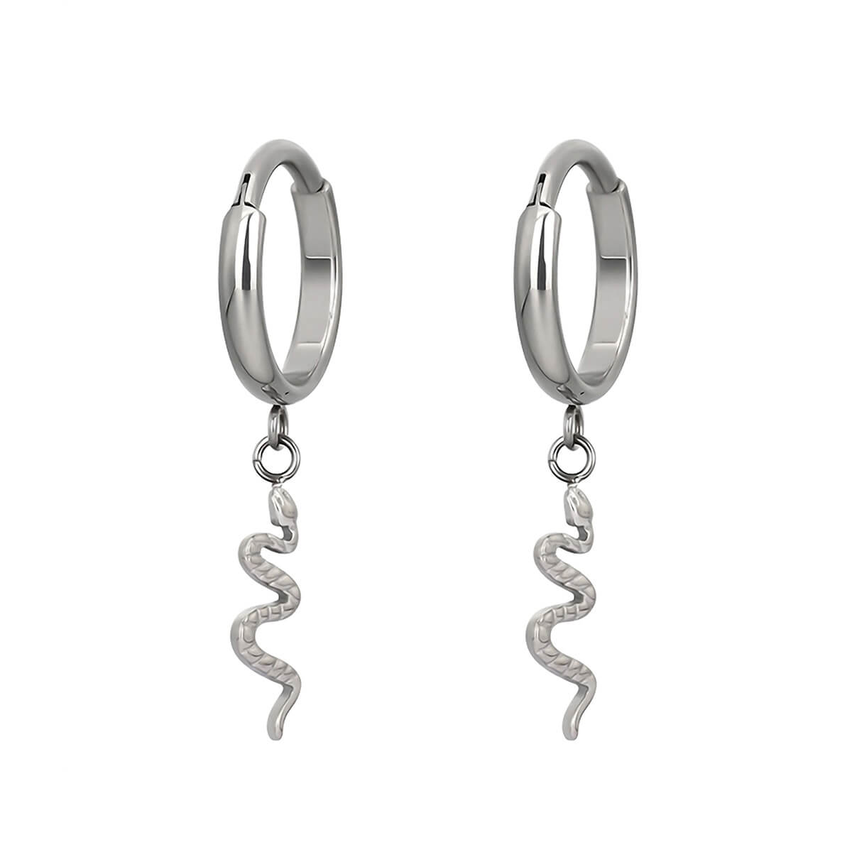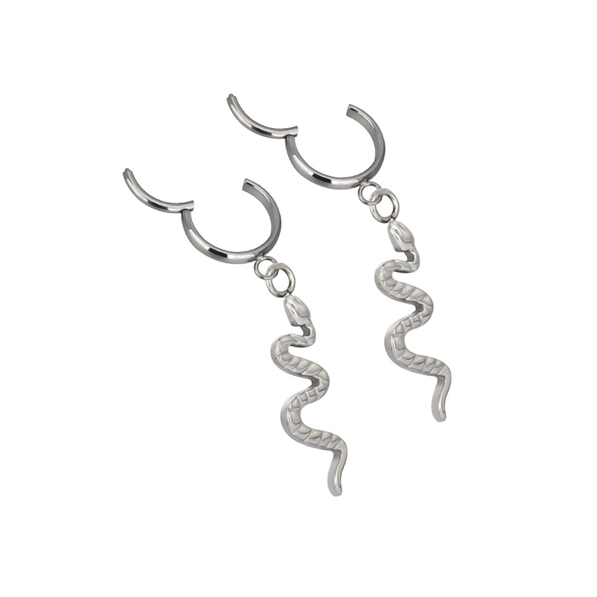 Titanium gives the best choice of material for earrings. In this design, a snake hangs from a titanium earring. The delicate earring is opened and locked with a snap. The jewellery is made entirely of titanium.