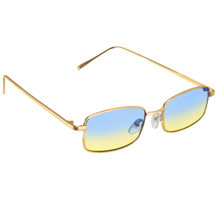 Trendy rectangular sunglasses with thin metal rods are a personal choice. The colourful lenses give the glasses a unique look.
