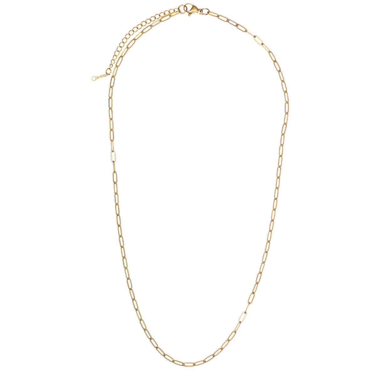 The trendy cable chain is back. This cable necklace is made of surgical steel and is made with the PVD gold plating method. The jewellery is made entirely of surgical steel.