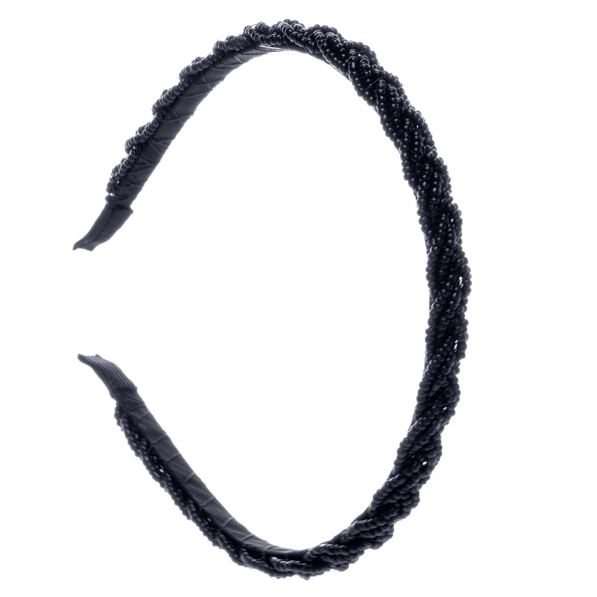 The narrow metal hairband is comfortable to hold and the body can be shaped by bending. The glass bead braided surface creates an elegant shine to the headband.