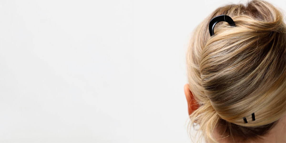 Contact French hair pin and insert its prongs through the bun towards the scalp. First push it through the hair, then turn the tip of the needle back towards the hair and slide it deeper to lock the pins in place. This is surprisingly easy to do and stays securely in place without any complicated positioning.
