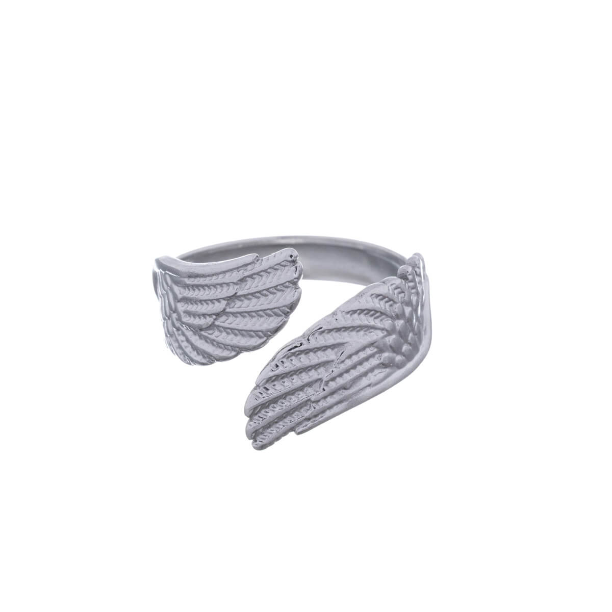 Angel wings adorn the front of this ring. The one size fits all ring is easy to wear, as the size can be adjusted to fit your finger. The ring is made entirely of steel.
