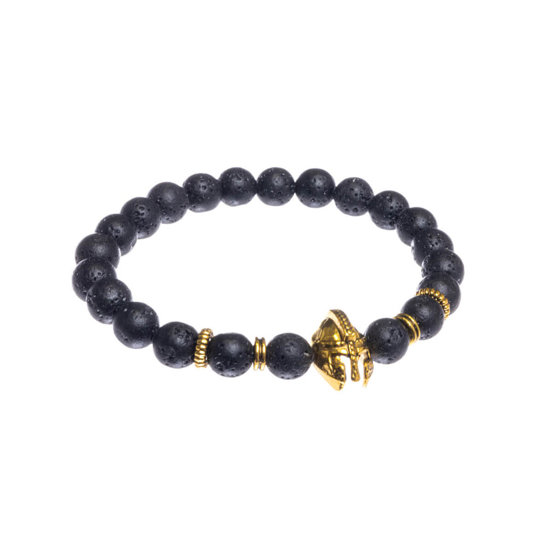 Lava stone bracelet decorated with a medieval helmet. The bracelet has a double silicone ribbon inside and is very flexible.