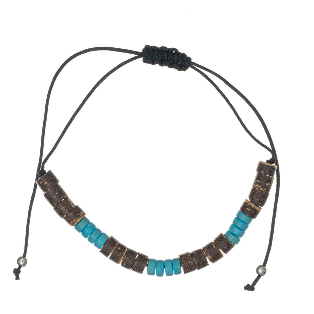 The brown wooden beads and turquoise beads braided on the cord are suitable for both men and women. A beautiful summer bracelet that brings to mind beaches and sunshine. The bracelet is adjustable, so it easily fits wrists of different sizes.